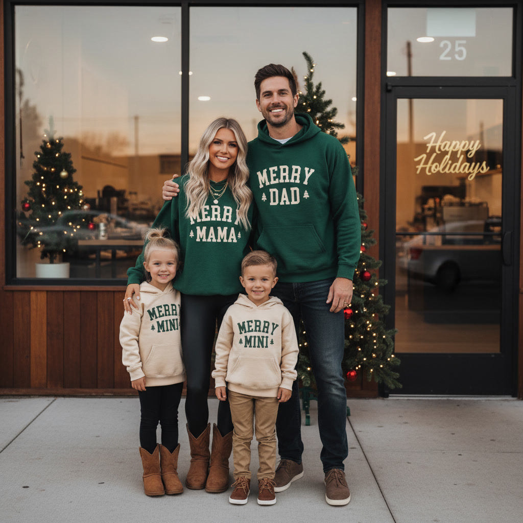 Get ready to get merry! Our “Merry Mommy,” “Merry Daddy,” & “Merry Mini” hoodies are the soft, snuggly trio your holiday season needs. Perfect for cocoa nights, family pics, and all the matching-magic moments.